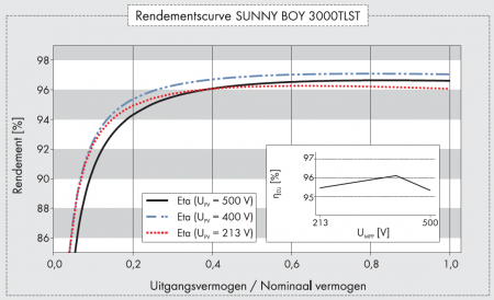 - Het specificatieblad van een inverter bevat meestal een diagram dat de efficiency weergeeft. Dit is de zogeheten rendementscurve. De rendementscurve van moderne inverters ligt vrij vlak. Dat wil zeggen dat vanaf een bepaald (laag) omzettingsniveau, zeg 20%, de inverter al een efficiency bereikt die minder dan 3% af ligt van het maximale rendement. Bijvoorbeeld 94% in plaats van 97%. Bij een belasting die minder is dan 20%, zeg 10% ligt het rendement al wel 7% onder het maximum. Bijvoorbeeld 90% in plaats van 97%. Zoals zichtbaar in onderstaande rendementscurve van de SMA Sunny Boy 3000TLST.