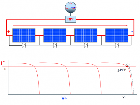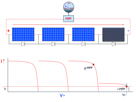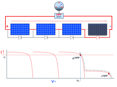 Onderstaande figuur toont wederom een string van 4 panelen waarvan 1 paneel beschaduwd is. Nu is een inverter aangesloten met een intelligente MPP-tracker die in staat is het werkelijke Maximum Power Point in deze situatie te vinden, aangeduid als g-MPP. Op het g-MPP wordt een vermogen van > 75% gegenereerd. De reden hiervoor is dat het beschaduwde paneel wordt gebypassed (Deze draagt namelijk niet bij aan een hogere opbrengst).